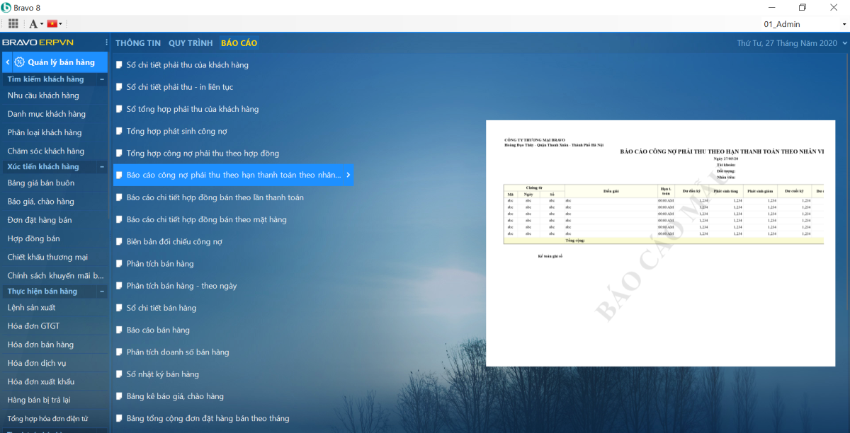 - In các loại báo cáo: Báo cáo bán hàng, Báo cáo công nợ, Báo cáo quản trị.