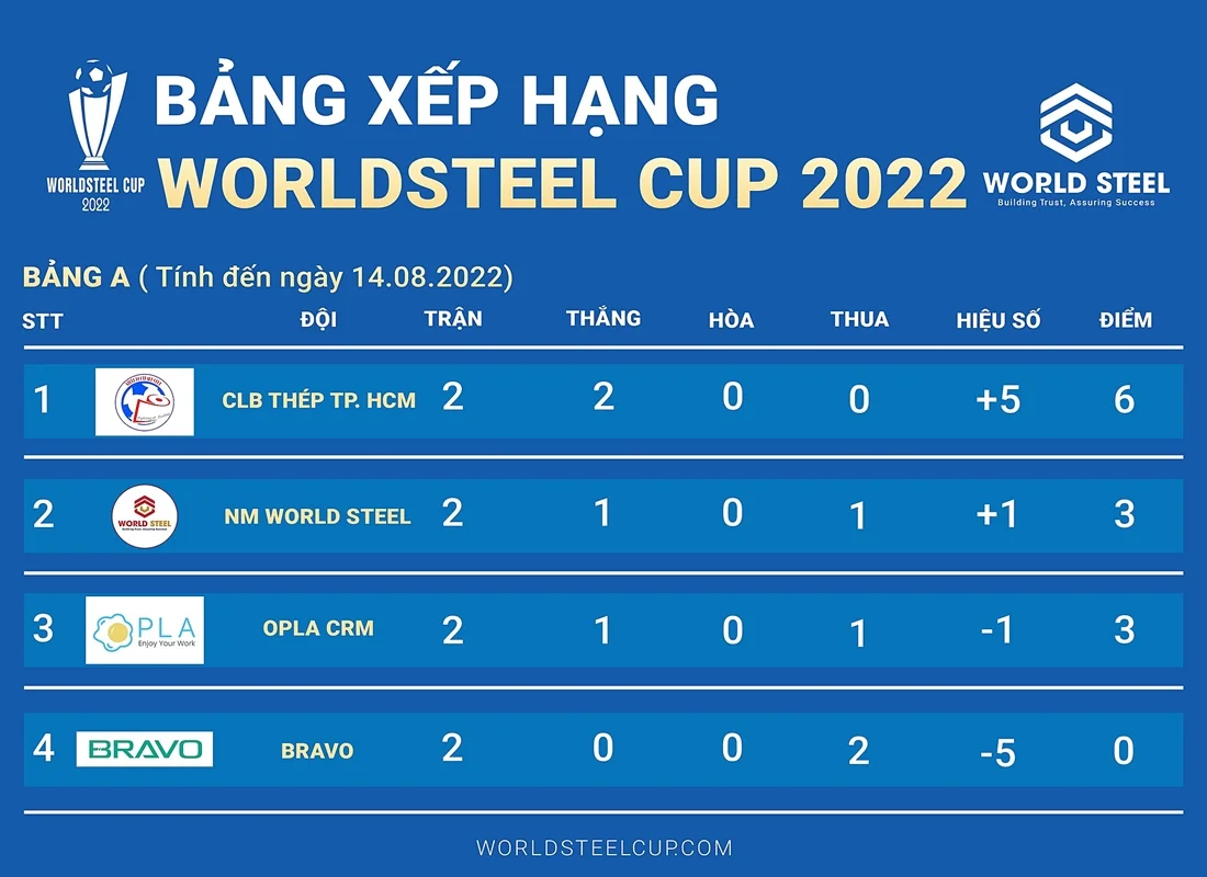 Bảng xếp hạng của Bảng A tính đến ngày 14.08