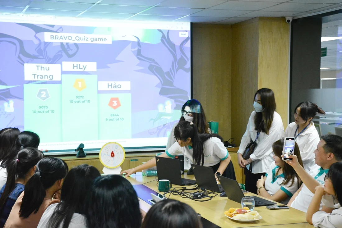 Dẫn dắt và đồng hành chính cùng các bạn sinh viên trong chương trình lần này là anh Phạm Anh Ngọc – Trưởng phòng Kỹ thuật Triển khai 2 và chị Phạm Thị Thủy – Trưởng nhóm Phòng Kinh doanh 1. Những chia sẻ đến từ các anh chị đã giúp các bạn sinh viên hiểu thêm về BRAVO (sản phẩm/ dịch vụ, văn hóa BRAVO, các vị trí tuyển dụng, cơ hội thực tập…); môi trường làm việc thực tế tại doanh nghiệp cũng như tích lũy thêm những yêu cầu ngành học và kỹ năng cần thiết, từ đó có định hướng rõ ràng hơn trong quá trình học tập của mình.