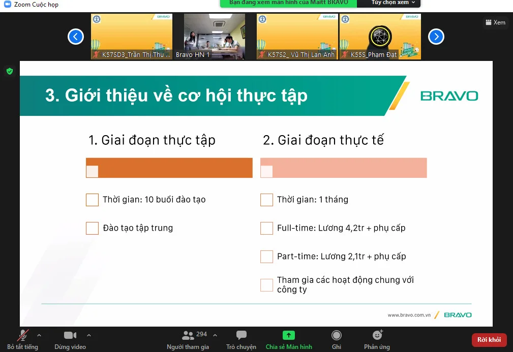 Trong suốt 2 giờ diễn ra chương trình, các bạn sinh viên đã được nghe giới thiệu về những thông tin, môi trường, văn hóa doanh nghiệp tại BRAVO, cơ hội việc làm và các chế độ phúc lợi của BRAVO dành cho CBNV, đồng thời được các anh chị tại BRAVO tư vấn tận tình về cơ hội của sinh viên ngành HTTT nói chung, những kỹ năng kiến thức cần thiết chuẩn bị trước khi ra trường, cũng như cách thức tuyển dụng, cách thức đăng ký thực tập tại BRAVO. Do hình thức trực tuyến có nhiều giới hạn, các bạn sinh viên không thể trực tiếp tham quan văn phòng công ty cũng như trao đổi trực tiếp với các anh chị tại BRAVO, tuy vậy việc tham gia chương trình trực tuyến cũng mang lại nhiều “trải nghiệm mới”. Phần Q&A cuối chương trình có lẽ là phần sôi nổi nhất khi các bạn sinh viên cũng nhiệt tình đặt ra rất nhiều câu hỏi cho đại diện của BRAVO. Các câu hỏi, thắc mắc đều được đại diện BRAVO giải đáp cặn kẽ.