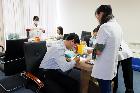 Các CBNV xếp hàng, thực hiện hướng dẫn để lấy mẫu máu tại văn phòng Công ty
