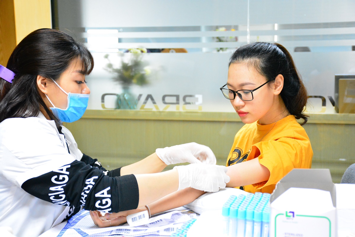 Các bác sỹ tiến hành lấy máu trong buổi khám đầu tiên tại văn phòng công ty