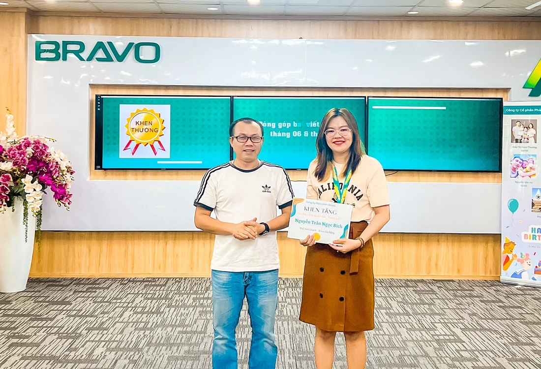 Bên cạnh cúp NVXS tháng, BRAVO ĐN cũng vui mừng trao tặng giải nhuận bút “Góp gạch xây nội san” tháng 6 và tháng 7 cho CBNV Nguyễn Phước Thảo Loan – Phòng Kỹ thuật triển khai và Nguyễn Thị Kim Ngân – Phòng Bảo Hành.