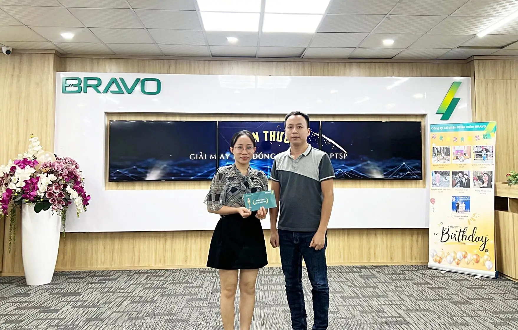 Sáng ngày 4/6/2024, tại sảnh văn phòng, đại diện BLĐ BRAVO ĐN đã lên chúc mừng và trao phần thưởng tới tận tay CBNV.