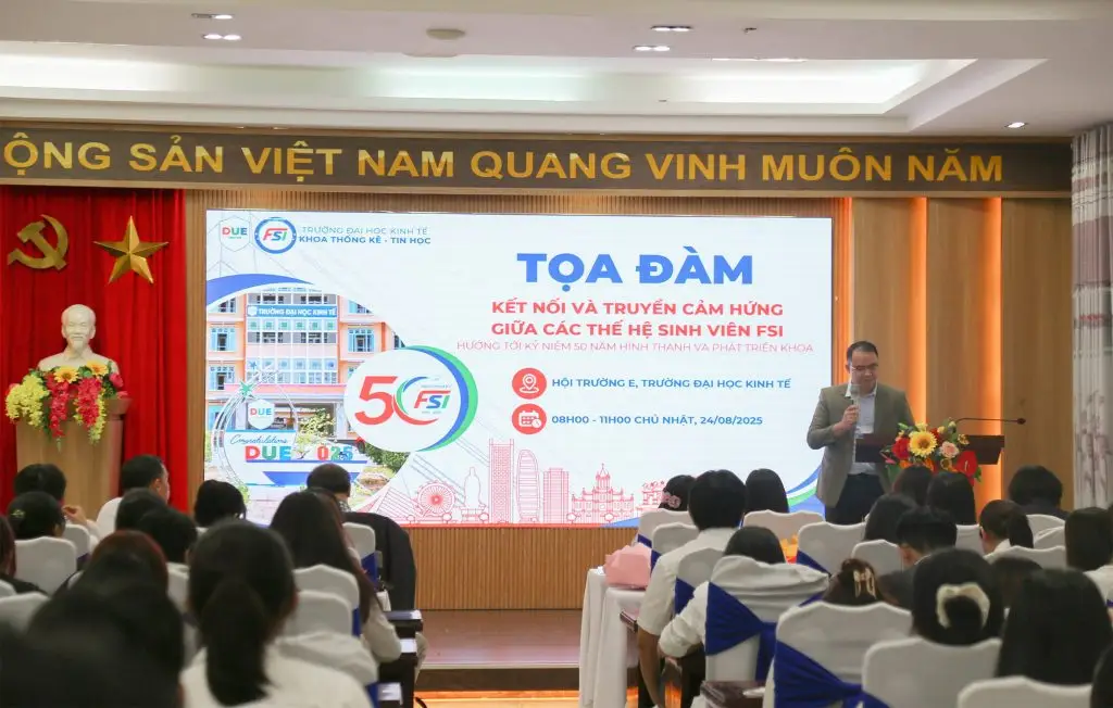 Sáng ngày 24/08/2025, tại Hội trường E – Trường Đại học Kinh tế – Đại học Đà Nẵng, chương trình tọa đàm đặc biệt với chủ đề “Kết nối & truyền cảm hứng giữa các thế hệ sinh viên FSI” đã diễn ra thành công, hướng đến kỷ niệm 50 năm thành lập Khoa Thống kê – Tin học.