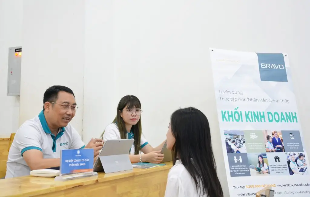 Ngay tại bàn tuyển dụng của BRAVO, đông đảo sinh viên năm cuối đã tham gia phỏng vấn trực tiếp, trao đổi và đánh giá năng lực cá nhân cùng đội ngũ quản lý của công ty. Không chỉ là dịp để tiếp cận cơ hội trở thành Thực tập sinh tại BRAVO, sự kiện còn là môi trường thực tế giúp sinh viên rèn luyện kỹ năng giao tiếp, thuyết trình và giải quyết vấn đề – những kỹ năng mềm quan trọng trong hành trình phát triển nghề nghiệp.