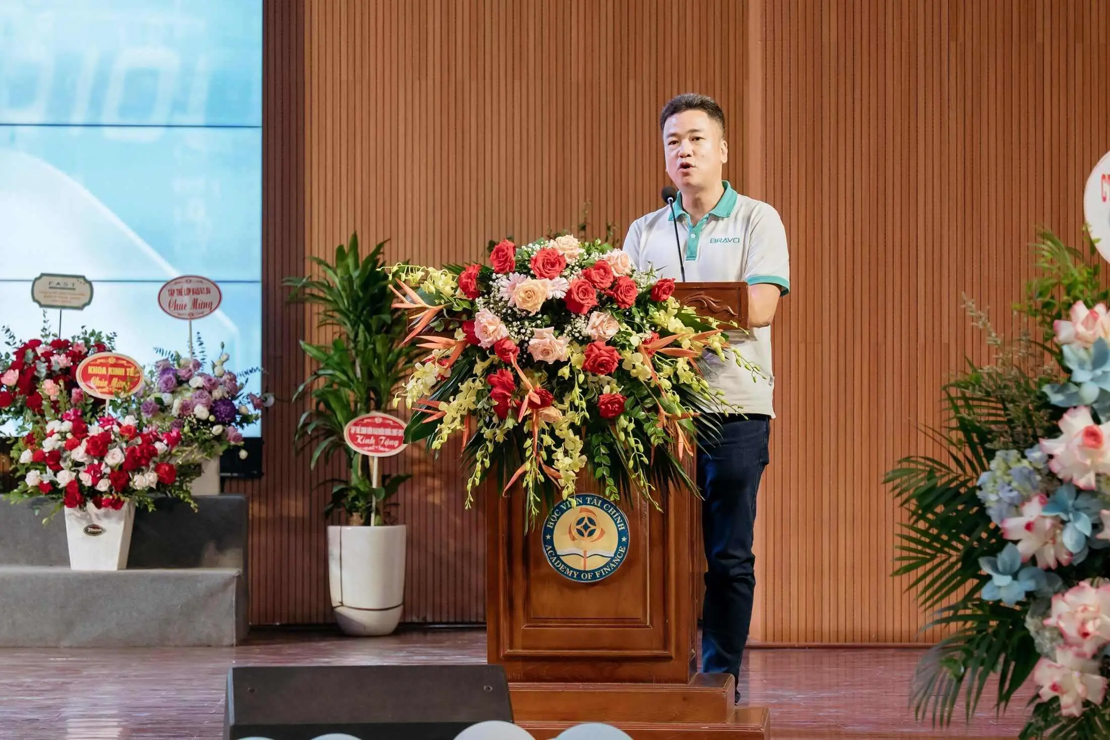 Ảnh: Đại diện BRAVO – Ông Ninh Ngọc Hiếu, Trưởng phòng Kỹ thuật Triển khai số 3 phát biểu chúc mừng ngày nhà giáo Việt Nam 20/11 và chúc mừng kỷ niệm 20 năm thành lập Khoa HTTTKT