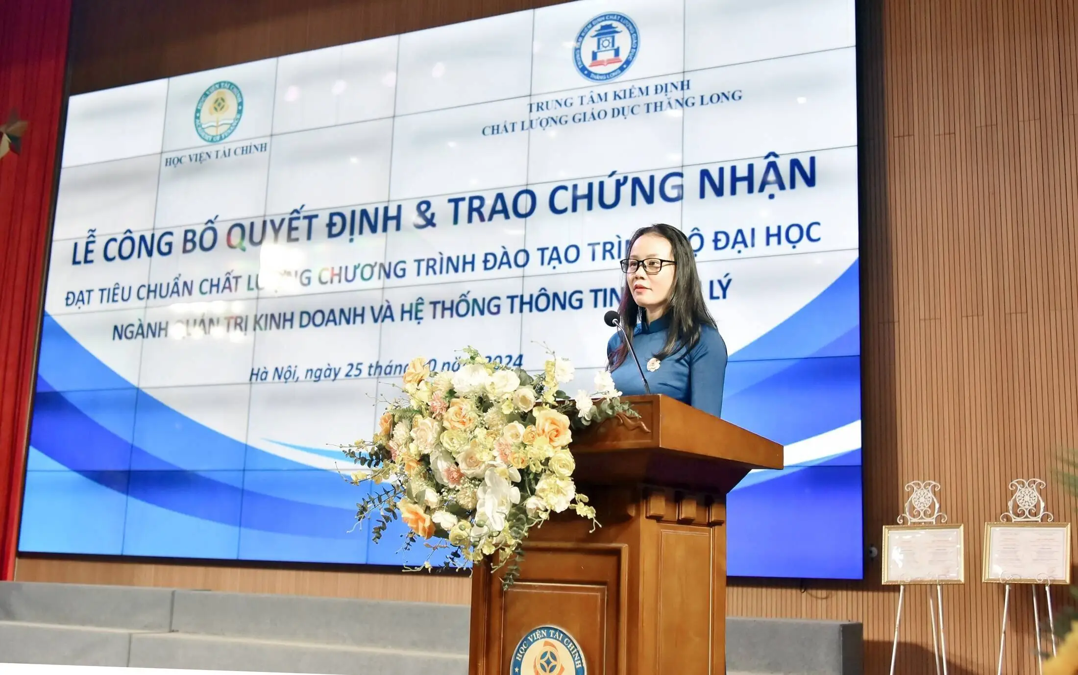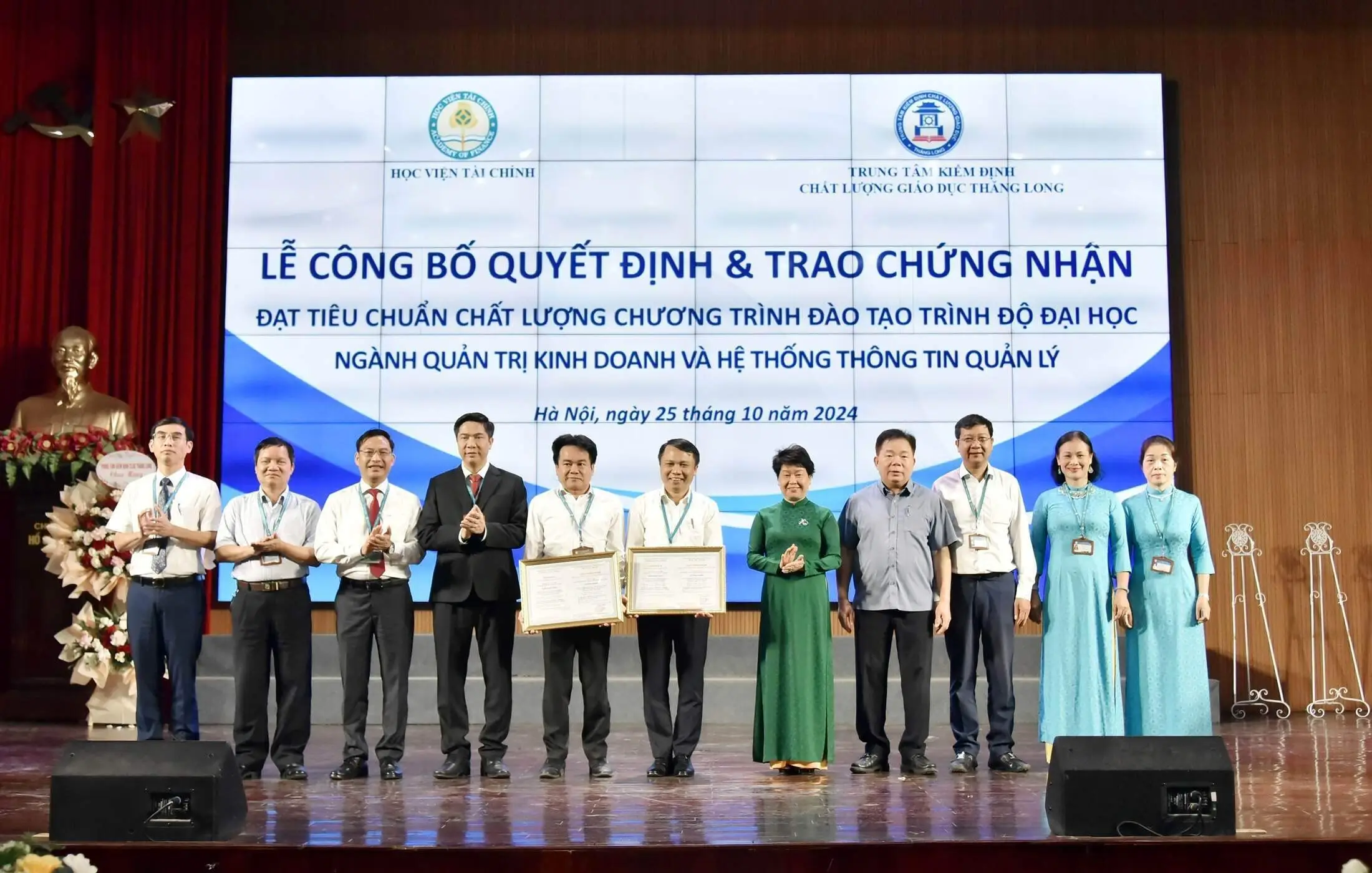 Ngày 25/10/2024, tại Hội trường 700, Học viện Tài chính đã long trọng tổ chức Lễ công bố quyết định và trao chứng nhận đạt chuẩn chất lượng cho hai chương trình đào tạo ngành Quản trị Kinh doanh (QTKD) và Hệ thống Thông tin Quản lý (HTTTQL), được công nhận bởi Trung tâm Kiểm định Chất lượng Giáo dục (KĐCLGD) Thăng Long. Đây là cột mốc ý nghĩa, đánh dấu nỗ lực của Học viện trong công tác đảm bảo chất lượng giáo dục, đáp ứng các tiêu chuẩn kiểm định khắt khe và mong đợi của xã hội.