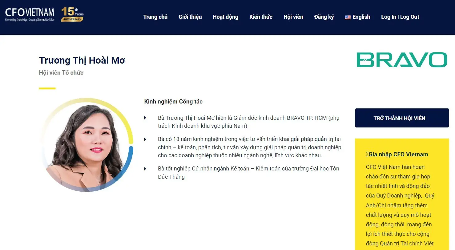Ngày 31/7/2024, tại khách sạn Liberty Central Saigon Centre, CFO Việt Nam đã tổ chức thành công lễ ra mắt Cộng đồng Mentors Chuyên nghiệp về Tài chính (CFO Mentors Community), bao gồm 50 mentors là quản lý cấp cao của các doanh nghiệp tiêu biểu. Bà Trương Hoài Mơ, Giám đốc Kinh doanh BRAVO HCM vinh dự gia nhập CFO Mentors Community.