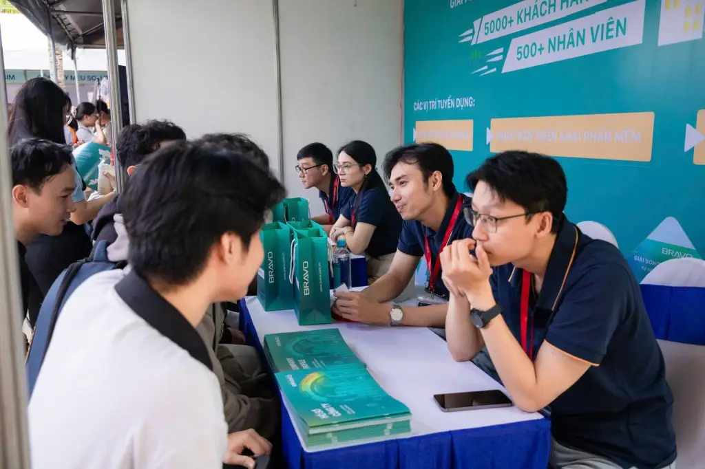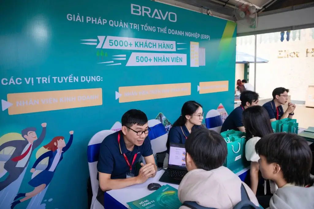 Trong suốt thời gian diễn ra chương trình, gian hàng tuyển dụng của BRAVO HCM luôn thu hút đông đảo sinh viên ghé thăm. Không chỉ mang đến những vị trí tuyển dụng hấp dẫn và chương trình thực tập tiềm năng, đội ngũ BRAVO còn nhiệt tình tư vấn hướng nghiệp, chia sẻ kinh nghiệm làm việc, và giới thiệu về môi trường làm việc chuyên nghiệp, năng động tại BRAVO.