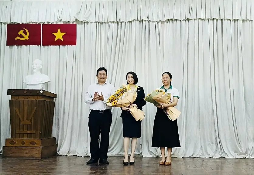 Ảnh: Đại diện BLĐ nhà trường gửi lời cảm ơn sâu sắc tới đại diện doanh nghiệp