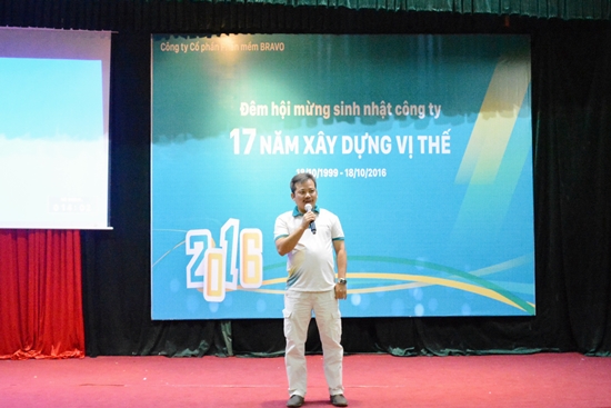Lễ kỷ niệm 17 năm thành lập BRAVO chính thức được khai mạc lúc 20h tại Hội trường lớn Khu du lịch Khoang Xanh - Suối Tiên. Mở đầu chương trình là bài phát biểu của anh Đào Mạnh Hùng - Giám đốc BRAVO chia sẻ về hành trình 17 năm của BRAVO, lời cảm ơn và lời chúc mừng sinh nhật tới BRAVO, cùng toàn thể nhân viên công ty.