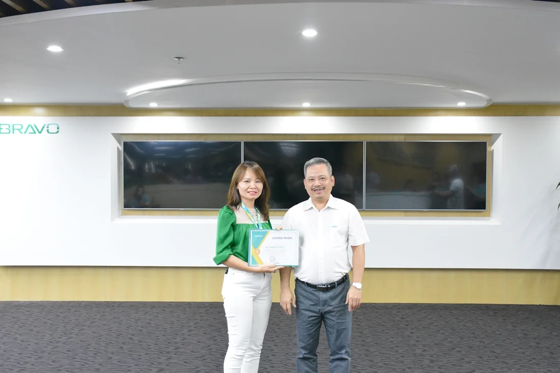Khen thưởng CBNV Kinh doanh Lê Thị Hòa (phòng Kinh doanh 2) và Nguyễn Văn Minh (Trưởng phòng Giải pháp và Tư vấn) đã phối hợp, ký kết thành công hợp đồng cung cấp phần mềm BRAVO cho Công ty Cổ phần In Hà An.
