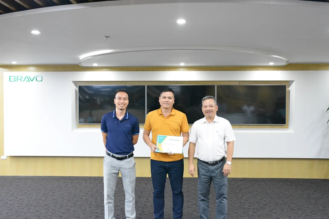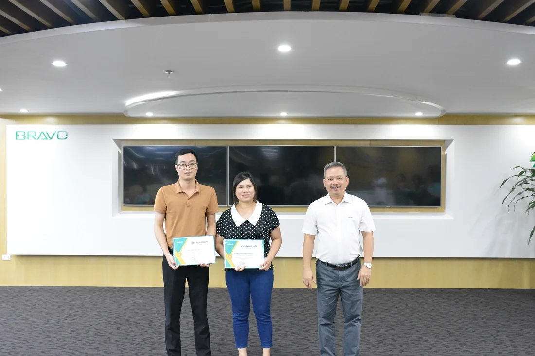 Khen thưởng CBNV Kinh doanh Trần Thị Thanh Hòa và Nguyễn Anh Tuấn (phòng Kinh doanh 2) cùng Đỗ Đại Lộc (phòng Giải pháp và Tư vấn) đã phối hợp, ký kết thành công hợp đồng cung cấp phần mềm BRAVO cho Công ty Cổ phần Thiết bị và Giải pháp cơ khí AUTOMECH.