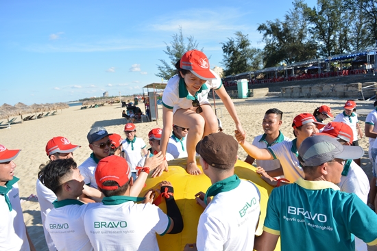 Chiều cùng ngày, tất cả cùng nhau tập trung, quay lại bãi biển để tham gia Team Building – một hoạt không thể thiếu trong những chuyến du lịch của BRAVO. Năm nay, với sự đầu quân hùng hậu của đại gia đình BRAVO, bốn đội chơi đã nhập cuộc, hào hứng tham gia các phần thi, tạo hình xếp chữ vô cùng ấn tượng, náo nhiệt, khuấy động cả một khu vực bãi biển Nhật Lệ.