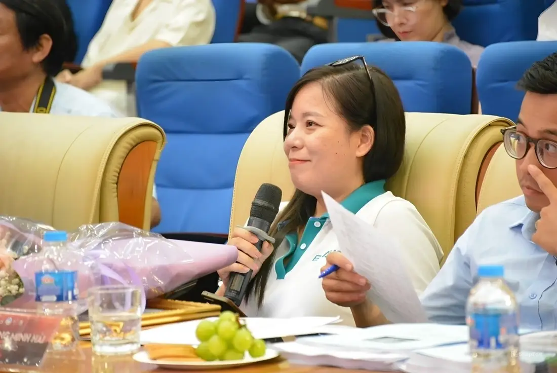 Ảnh: Giám khảo Ngô Thị Hạnh đặt câu hỏi trong phần thi “Thuyết trình” của các đội