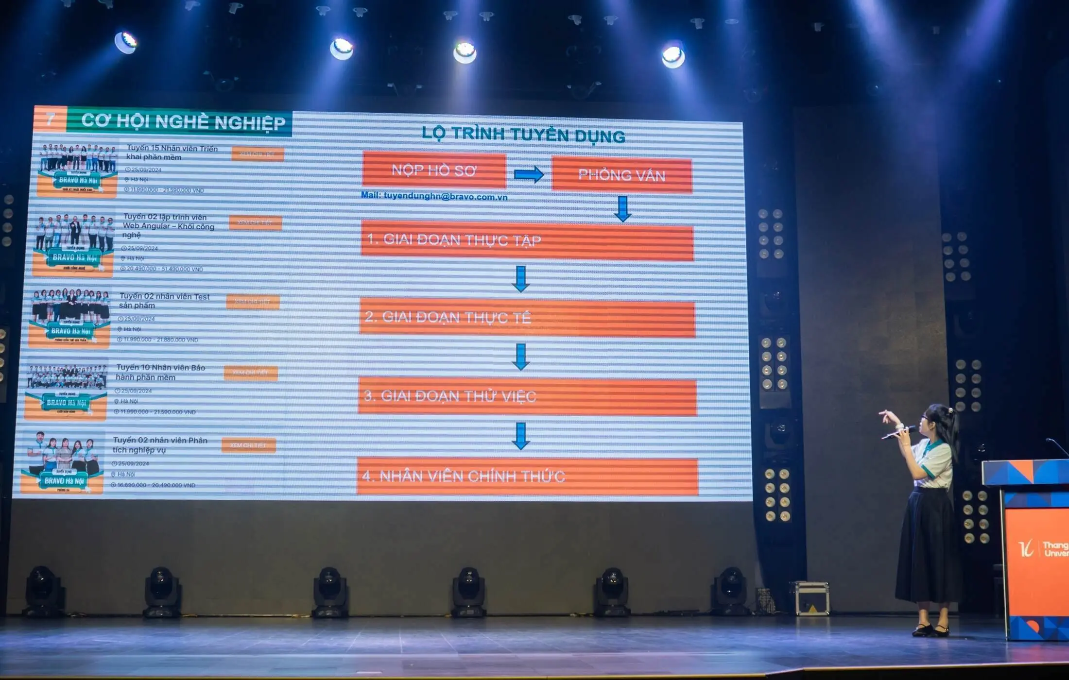 Trước khi đến với phần tọa đàm giữa sinh viên và doanh nghiệp, chị Nguyễn Ngọc Quỳnh – Phụ trách nhân sự đã có phần chia sẻ với các bạn sinh viên nội dung về: BRAVO (lịch sử hình thành, quan điểm nhân sự, cơ cấu phòng ban, sản phẩm chính, các hoạt động nổi bật…); Cơ hội thực tập; Lộ trình tuyển dụng tại BRAVO.