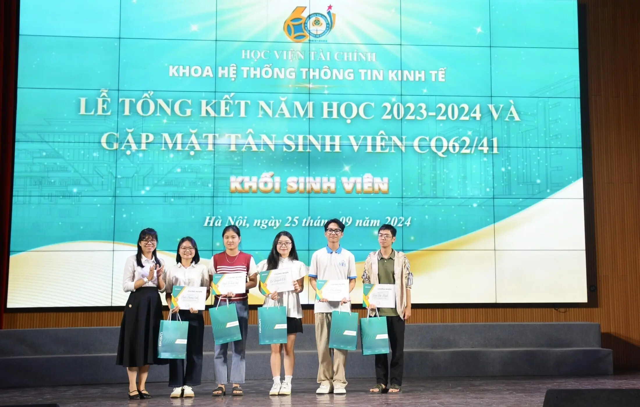 Tối ngày 25/09/2024, tại HT700 Học viện Tài chính, Lễ Tổng kết năm học 2023 – 2024 của Khoa HTTTKT đã được long trọng tổ chức với sự tham dự của các vị đại biểu, giảng viên khoa, doanh nghiệp đối tác cùng đông đảo sinh viên. Là doanh nghiệp hợp tác với Khoa, Công ty Cổ phần Phần mềm BRAVO (văn phòng Hà Nội) đã vinh dự được đồng hành, tham dự và trao học bổng cho các sinh viên có thành tích xuất sắc bao gồm: thủ khoa đầu vào của CQ62 và sinh viên năm 3 có kết quả học tập xuất sắc trong năm học vừa qua.