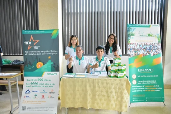 Về phía các doanh nghiệp tham gia lần này, đại diện Công ty Cổ phần Phần mềm BRAVO có anh Đoàn Văn Quyền –Trưởng phòng Kỹ thuật triển khai 1, anh Hoàng Văn Tuấn – CBNV phòng Công nghệ và chị Nguyễn Ngọc Quỳnh – Trưởng nhóm Nhân sự công ty đã tới tham dự sự kiện trong vai trò đơn vị tuyển dụng.