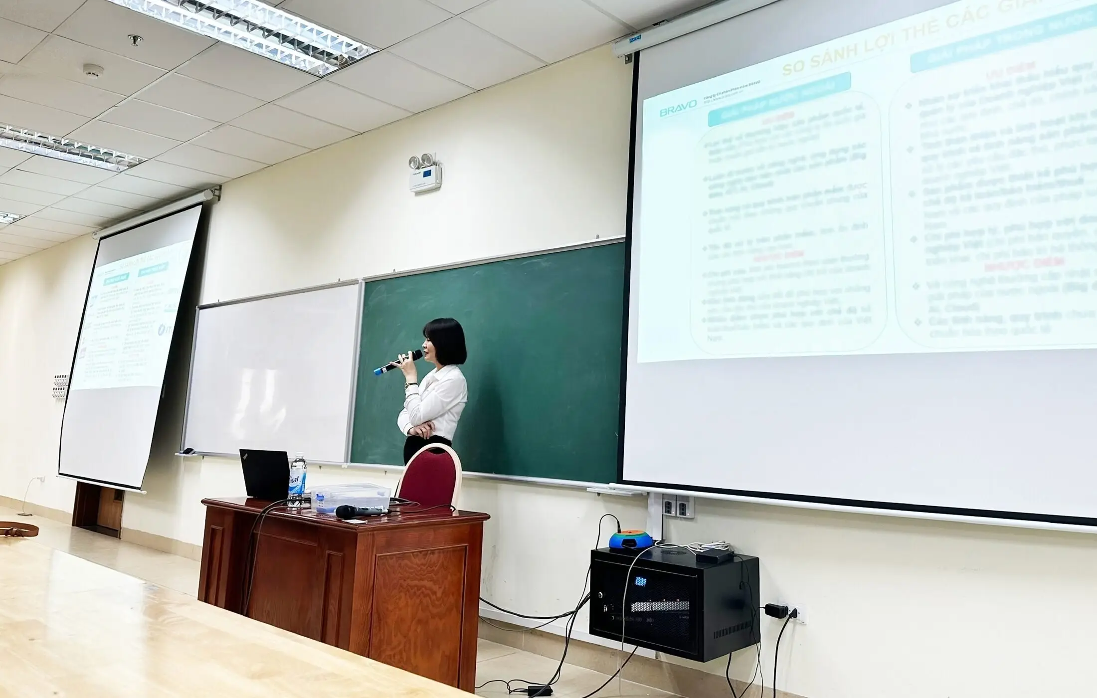 Tham gia buổi đào tạo lần này, đại diện BRAVO có anh Đoàn Văn Quyền – Trưởng Phòng Kỹ thuật Triển khai 1, chị Phạm Thị Thủy – Trưởng nhóm Phòng Kinh doanh 1 và chị Nguyễn Ngọc Quỳnh – Phụ trách nhân sự đã tham dự chương trình với tư cách là diễn giả, trực tiếp đào tạo cho các bạn sinh viên.