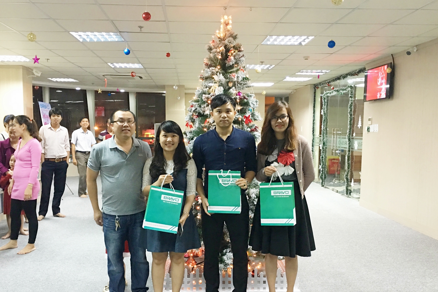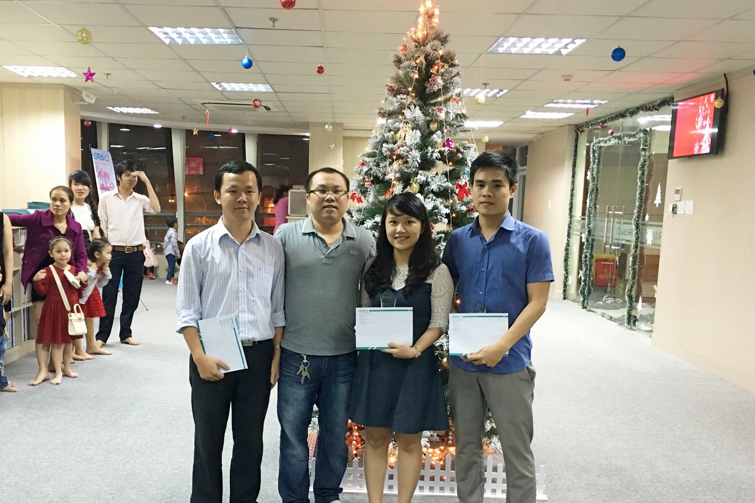 Bữa tiệc Noel của Đà Nẵng chỉ diễn ra sau BRAVO-HCM một ngày, tức là tối 24/12. Nhưng trong ngày hôm đó, các thành viên đã đón những sự kiện tưng bừng của tháng, không chỉ riêng Noel. Đầu tiên là Cup nhân viên xuất sắc tháng 11 được trao cho các thành viên: Phạm Lê Minh Hiếu – Phòng Kinh doanh, Nguyễn Văn Huy – Phòng Kỹ thuật, Lê Tấn Hiệp và Nguyễn Hoàng Tín – Phòng Bảo hành.