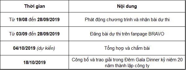 Thời gian nhận bài dự thi từ 19/08 đến 28/09/2019. Sau khi bài dự thi hợp lệ sẽ được đăng tải lên fanpage BRAVO từ 03/09 đến 28/09/2019, các CBNV có thể vận động bạn bè likes, share và comment để BTC làm căn cứ xét điểm, chấm bài.