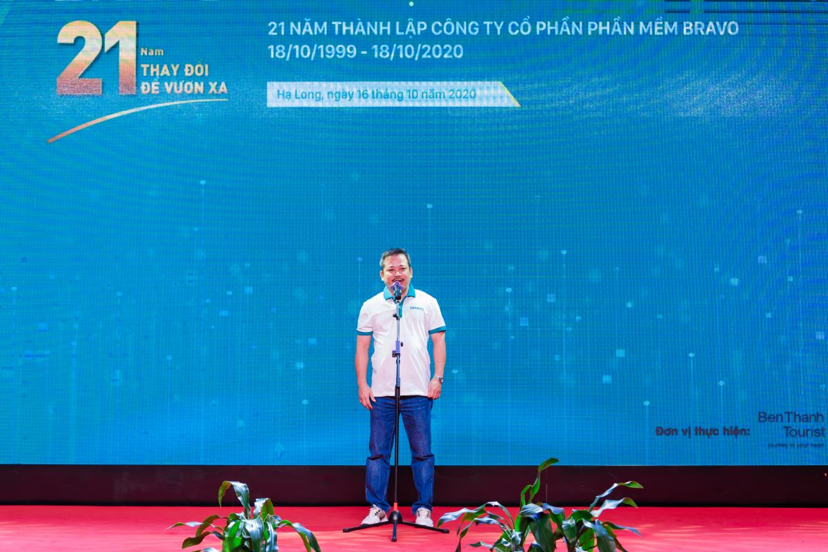 Tối 16/10, Lễ kỷ niệm 21 năm thành lập Công ty Cổ phần Phần mềm BRAVO đã được diễn ra trang trọng tại Nhà hàng của khách sạn Mường Thanh Luxury. Mở đầu chương trình là lời phát biểu, chia sẻ đầy xúc động từ GĐ. Đào Mạnh Hùng về hành trình 21 năm tạo lập, phát triển của BRAVO. GĐ. Đào Mạnh Hùng cũng gửi lời cảm ơn và lời chúc mừng sinh nhật tới BRAVO, cùng toàn thể nhân viên công ty, lời tri ân sâu sắc đến những người thân CBNV – hậu phương vững chắc để giúp các thành viên BRAVO luôn tin tưởng, yên tâm công tác, cống hiến vì sự phát triển của Công ty.