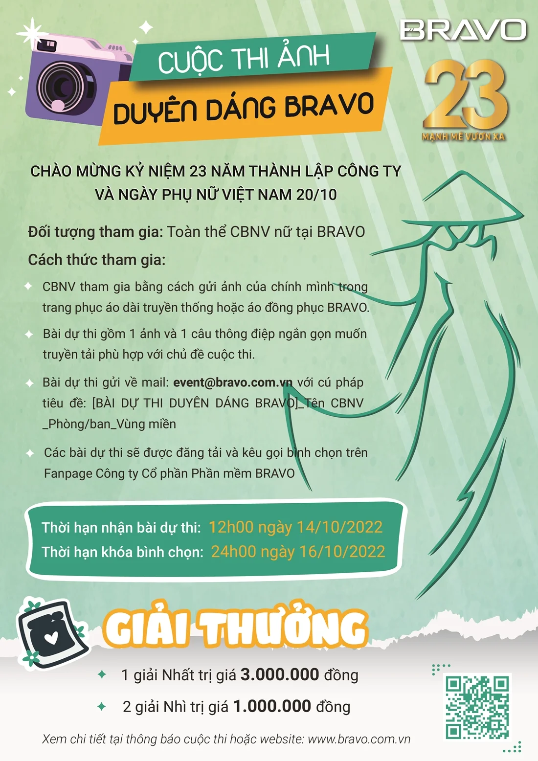 Để chào mừng Kỷ niệm 23 năm thành lập công ty (18/10/1999 - 18/10/2022) và Ngày Phụ nữ Việt Nam 20/10, BRAVO phát động cuộc thi ảnh “Duyên dáng BRAVO” dành cho tất cả CBNV nữ trong công ty.