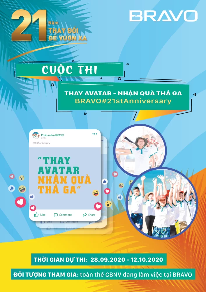 Cuộc thi “THAY AVATAR – NHẬN QUÀ THẢ GA”, một sự kiện đặc biệt trong tháng, một sân chơi thú vị nhằm hướng đến Lễ kỷ niệm 21 năm thành lập Công ty Cổ phần Phần mềm BRAVO (18/10/1999 - 18/10/2020). Hoạt động nhằm khơi gợi niềm tự hào về lịch sử hình thành và phát triển của BRAVO, đồng thời lan tỏa thông điệp của chương trình Kỷ niệm 21 năm thành lập công ty: “THAY ĐỔI ĐỂ VƯƠN XA” đến tất cả CBNV BRAVO tại 3 miền.