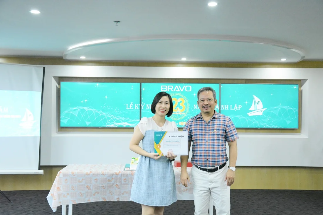 Cũng tại chương trình, giải thưởng của cuộc thi “Duyên dáng BRAVO” do Công ty phát động từ ngày 1/10 – 16/10 nhằm hướng tới kỷ niệm 23 năm thành lập công ty và chào mừng Ngày Phụ nữ Việt Nam 20/10, đã tìm được chủ nhận xứng đáng. Vượt qua 20 bài dự thi của các đối thủ nặng ký, chị Nguyễn Thu Huyền – TP Kiểm thử Sản phẩm BRAVO HN đã xuất sắc dẫn đầu bảng xếp hạng và đạt giải nhất “Duyên dáng BRAVO”.