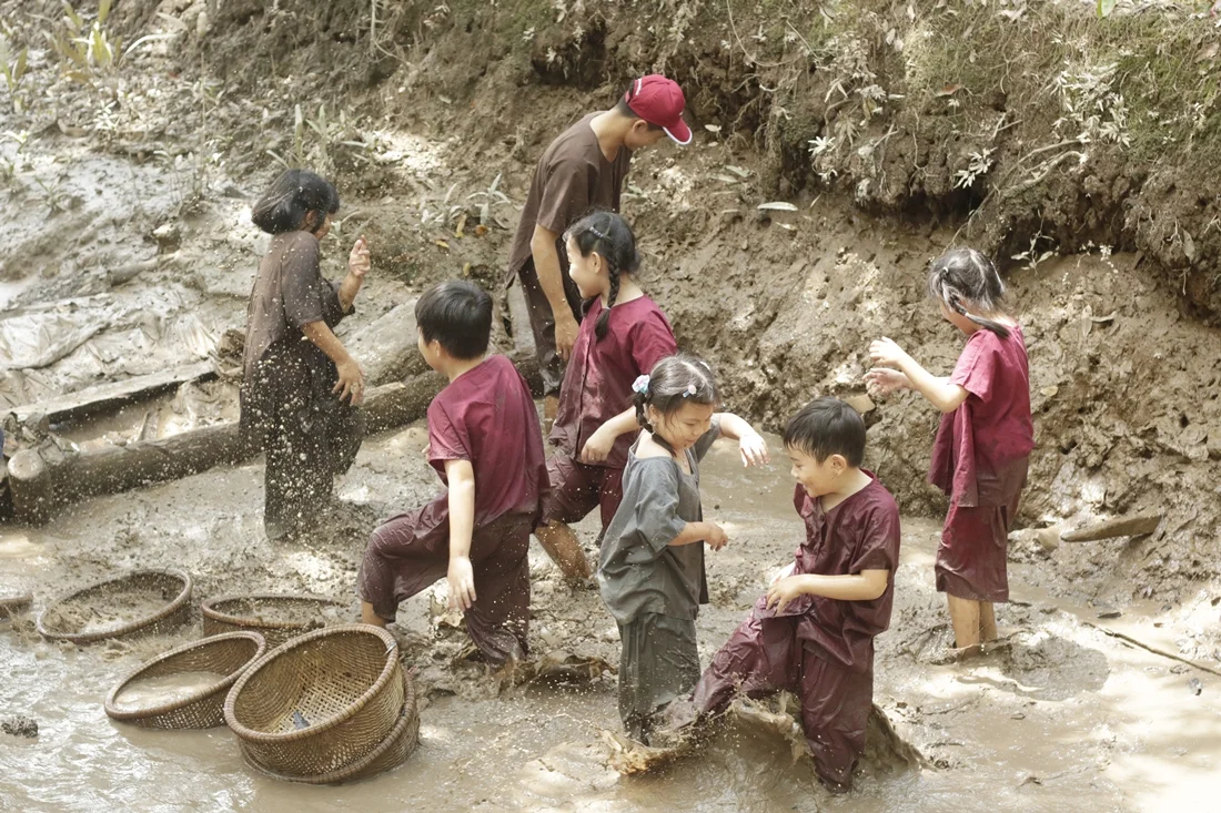 Các thành viên BRAVO nhí hào hứng với hoạt động tát nước bắt cá