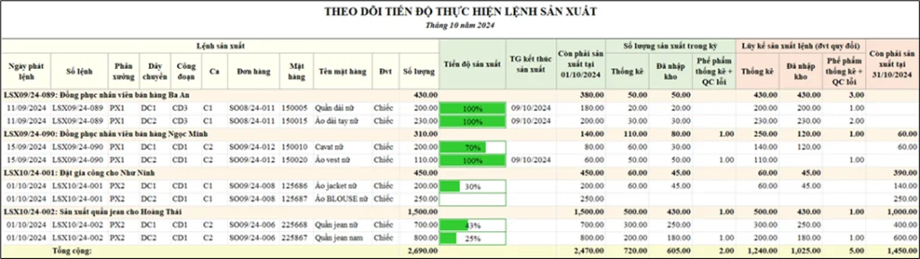 Hỗ trợ lãnh đạo theo dõi tiến độ, trạng thái thực hiện lệnh sản xuất theo số lượng yêu cầu trên lệnh, thực tế thống kê và nhập kho trong kỳ báo cáo và lũy kế từ khi phát sinh lệnh đến cuối kỳ báo cáo.