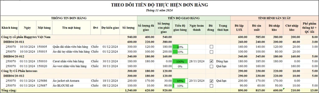 - Số liệu lũy kế từ khi phát sinh lệnh đến cuối kỳ giúp CEO đánh giá hiệu suất thực thi xuyên suốt, không chỉ tại một thời điểm. Điều này đặc biệt quan trọng với các đơn hàng lớn hoặc kéo dài nhiều kỳ, vì nó cho thấy xu hướng cải thiện hay suy giảm tiến độ theo thời gian.