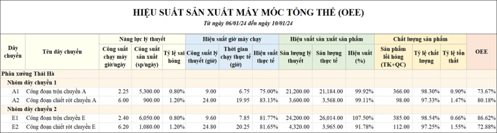 - Công suất giờ thực tế: Tổng giờ sản xuất của từng máy được ghi nhận trong "Nhật ký giờ hoạt động của máy" và tính trung bình cho cả dây chuyền.