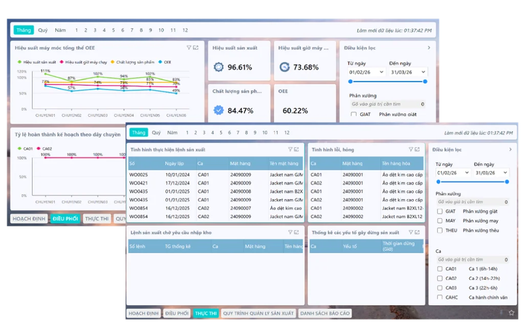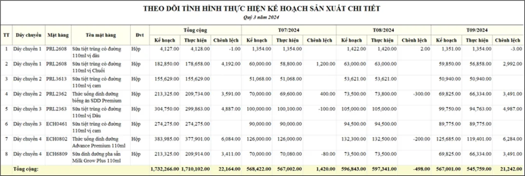 Hỗ trợ theo dõi tiến độ, phân tích tình hình sản xuất so với kế hoạch theo số lượng sản phẩm thống kê đồng thời đạt kiểm tra chất lượng. Báo cáo này giúp CEO trả lời câu hỏi cốt lõi: Có đạt kế hoạch không đồng thời phát hiện sớm nguy cơ chậm tiến độ, dồn việc cuối kỳ hoặc mất cân đối công suất giữa các chuyền.