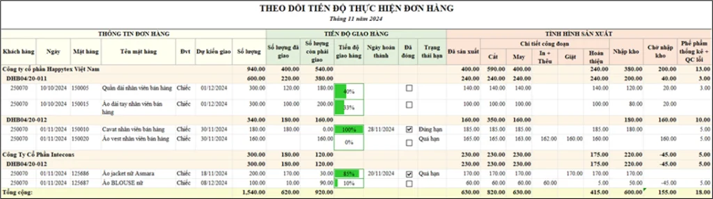 Màn hình báo cáo theo dõi tiến độ thực hiện đơn hàng theo chi tiết từng công đoạn