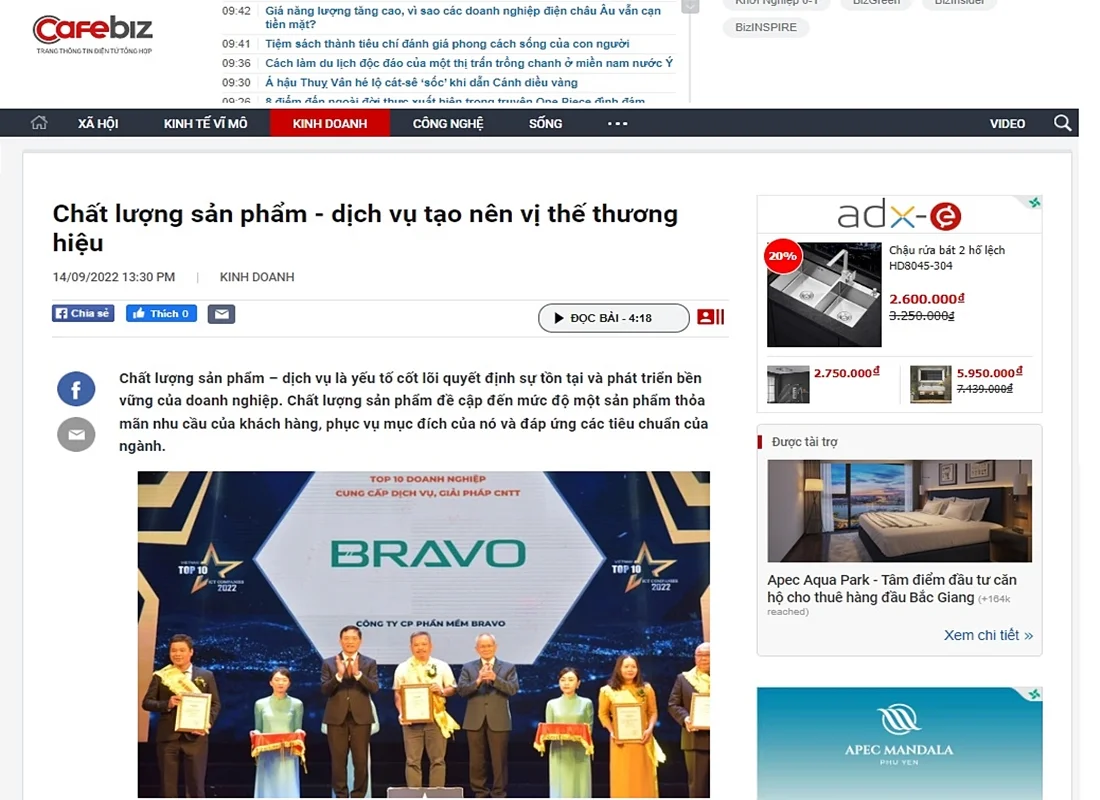 >> Dân trí: BRAVO vào Top 10 Doanh nghiệp CNTT Việt Nam 2022