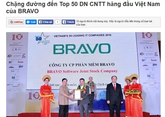 Công ty Cổ phần Phần mềm BRAVO là một trong 50 Doanh nghiệp CNTT hàng đầu Việt Nam 2016 trong lĩnh vực cung cấp phần mềm, giải pháp và dịch vụ CNTT với mức tăng trưởng doanh thu đạt 45% so với năm trước.
