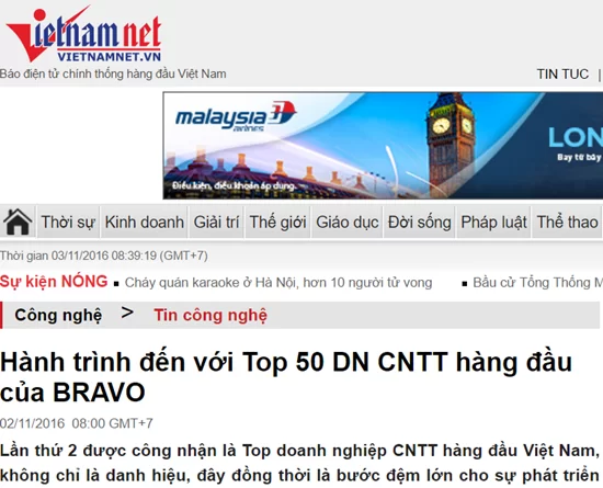 Thông tin về sự kiện nhận giải Top 50 DN CNTT hàng đầu Việt Nam của BRAVO ttrong chuyên mục Công nghệ - Báo Vietnamnet