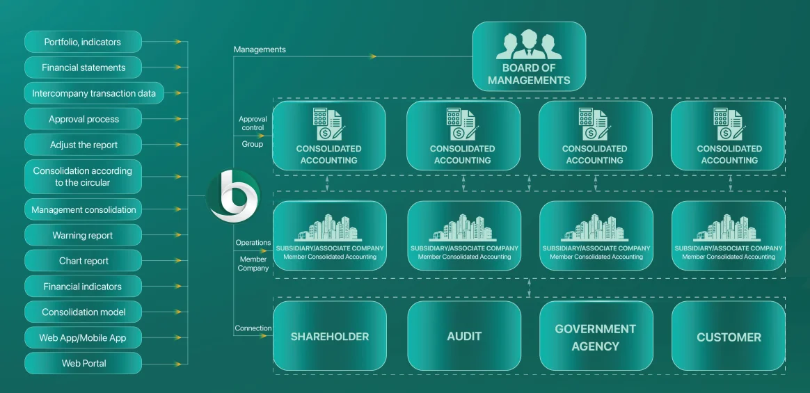 This is the direct operational layer that provides all data to prepare for the consolidation of group/corporation data. The detailed role function will perform and prepare, review the data of member units (List, set of indicators, set of financial reports, internal data set as required...). Use the system functions (Data warning function, reporting function...) to check the correctness of the data set sent for consolidation at the unit and perform the function of sending/transmitting reports/data to the consolidation software on the Group/Corporation before performing the next processes on the consolidation software.