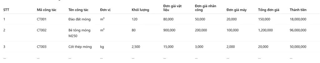 • Thành tiền = Khối lượng × Tổng đơn giá