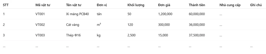 Bảng tổng hợp vật tư được sử dụng để liệt kê toàn bộ các loại vật liệu cần sử dụng trong công trình, kèm theo khối lượng và đơn vị tính. Mẫu biểu này giúp kiểm soát việc sử dụng vật liệu, hỗ trợ công tác mua sắm so sánh, lựa chọn nhà cung cấp vật tư phù hợp và quản lý kho một cách hiệu quả.