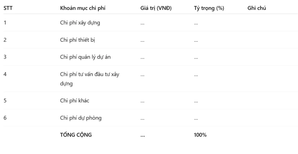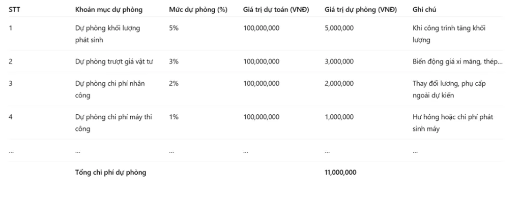 • Chi phí dự phòng: Khoản này dùng để xử lý các rủi ro như biến động giá hoặc thay đổi thiết kế.