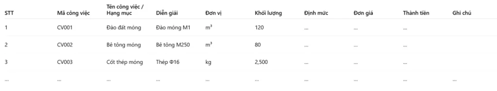 • Tên công việc / Hạng mục: Theo WBS hoặc danh mục công trình