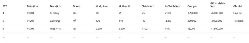 Trong thực tế, giá vật liệu thường có sự chênh lệch so với giá trong bộ đơn giá gốc. Do đó, bảng tổng hợp và chênh lệch vật tư được sử dụng để cập nhật giá vật liệu theo thị trường và tính toán phần chênh lệch này vào dự toán. Mẫu biểu này giúp đảm bảo dự toán phản ánh sát với thực tế, đồng thời hạn chế rủi ro do biến động giá cả.