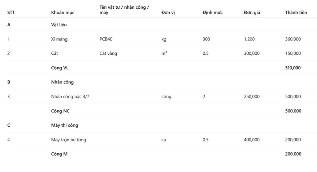 Bảng phân tích đơn giá thể hiện chi tiết cách hình thành đơn giá của từng công việc, bao gồm các yếu tố cấu thành như vật liệu, nhân công và máy thi công, là cơ sở để kiểm tra tính hợp lý của chi phí. Việc lập bảng phân tích đơn giá đặc biệt quan trọng trong các dự án yêu cầu thẩm tra kỹ lưỡng hoặc sử dụng đơn giá không có sẵn trong hệ thống định mức.