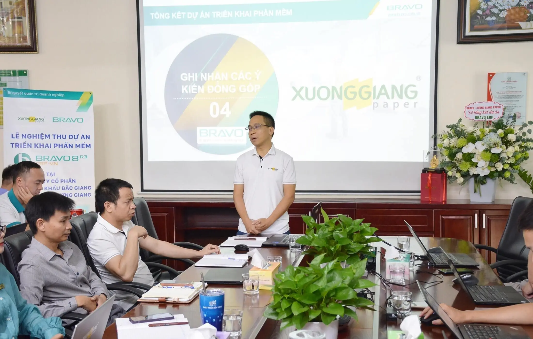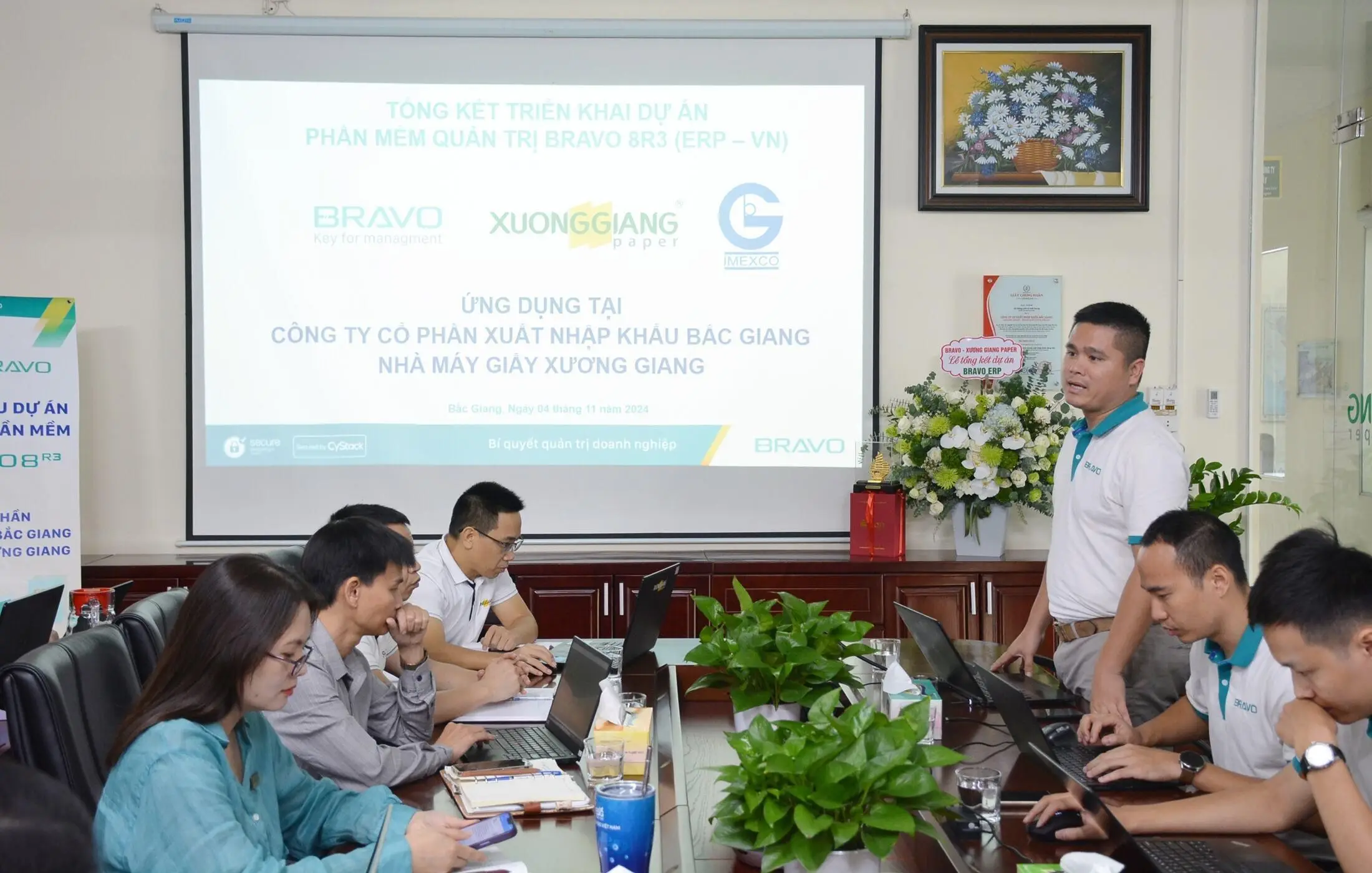 Khởi động dự án từ tháng 4/2024, sau quá trình nỗ lực triển khai và đảm bảo các nghiệp vụ đưa ra từ phía khách hàng, từ ngày 12/09/2024 dự án đã được nghiệm thu UAT và đưa vào hoạt động ổn định, dần đạt hiệu quả ứng dụng trong toàn hệ thống Nhà máy giấy Xương Giang. Sáng ngày 4/11/2024, Công ty CP Phần mềm BRAVO và Công ty CP Xuất nhập khẩu Bắc Giang – Nhà máy giấy Xương Giang đã cùng nhau tổ chức lễ “Tổng kết và nghiệm thu dự án triển khai phần mềm BRAVO ERP” trong không khí phấn khởi của toàn bộ thành viên Ban dự án.