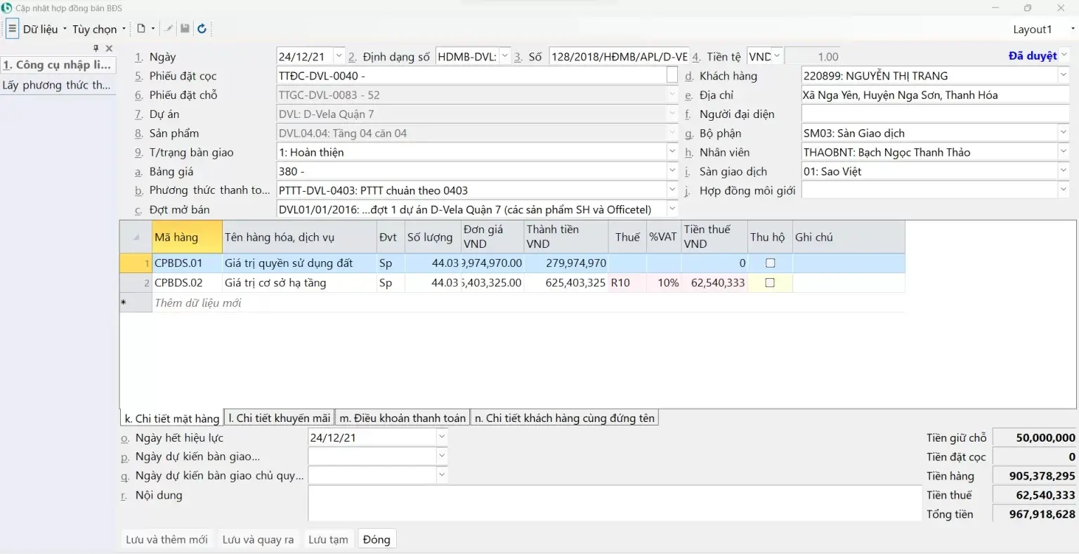 Giao diện màn hình “Cập nhật thông tin hợp đồng bán” trên phần mềm BRAVO