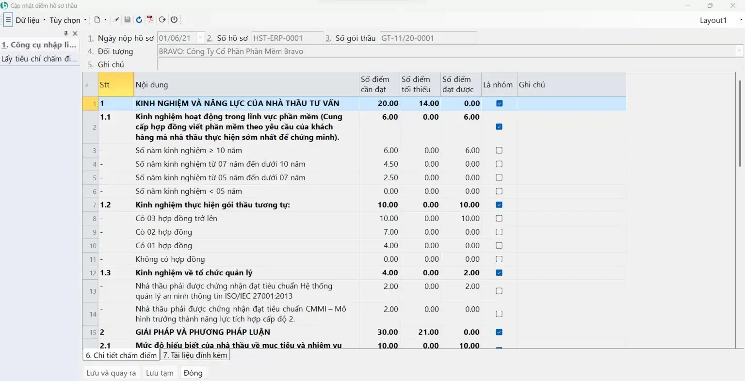 Giao diện màn hình “Cập nhật hồ sơ, đánh giá và lựa chọn nhà thầu” trên phần mềm BRAVO