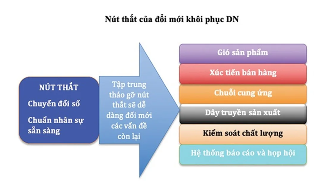 Đổi mới để phù hợp với xu hướng mới là yếu tố quyết định đến việc khôi phục DN. Mức độ thành công của quá trình này sẽ phụ thuộc vào mức độ phù hợp của nguồn lực mỗi DN. Có thể hiểu là, rất nhiều vấn đề cần thay đổi như phương thức xúc tiến thương mại, gói sản phẩm, kiểm soát chất lượng, bố trí sản xuất, kỹ năng của đội ngũ, chuỗi cung ứng, bán hàng... Mấu chốt của nút thắt đổi mới này chính là mức độ chuyển đổi số của DN và tính sẵn sàng của đội ngũ. Nếu doanh nghiệp chuẩn bị tốt tâm thế sẵn sàng cho người lao động, chuyển đổi số thành công thì không khó gì để thực hiện những thay đổi khác.
